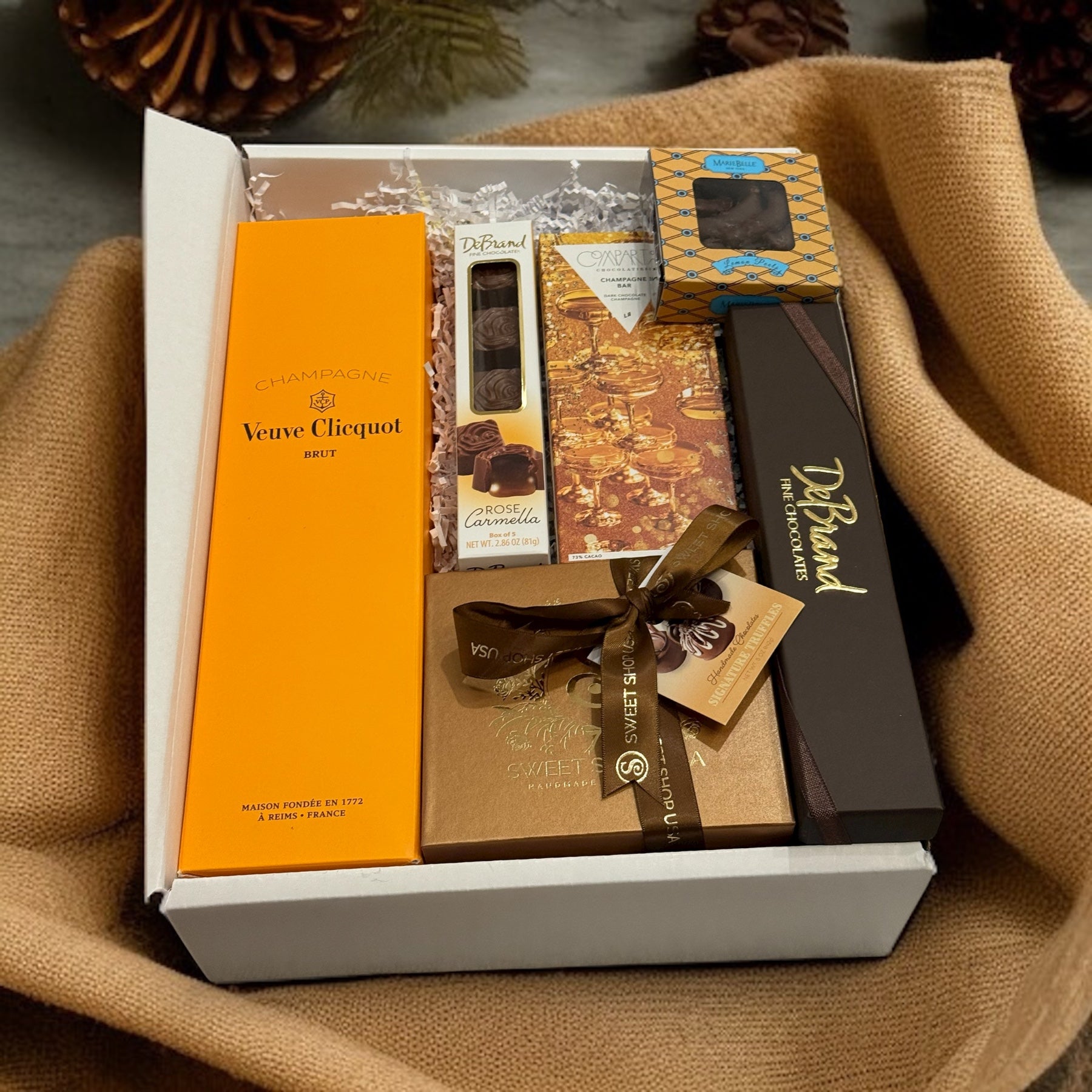 Indulge in an exquisite experience with this decadent gift box, featuring the celebrated Veuve Clicquot Yellow Label Brut, a perfectly balanced champagne with notes of apple and citrus. This iconic bubbly is elegantly paired with a sophisticated assortment of confections, including a rich champagne chocolate bar, a premium 6-piece truffle collection from DeBrand, and a selection of classic sweet shoppe truffles. For a unique and luxurious twist, the box also contains handcrafted chocolate dipped orange peels and the silky Debrand Rose Carmello truffles, with their soft, liquid caramel centers infused with a hint of rose water. This curated collection of gourmet delights provides a truly unforgettable sensory experience, perfect for celebrating any special occasion.