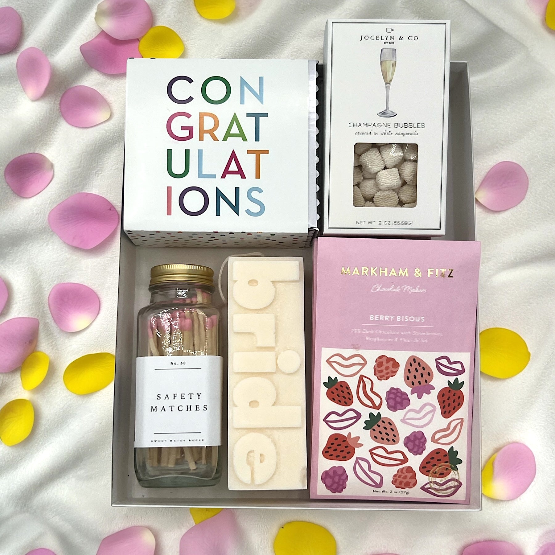 Celebrate the bride-to-be with this thoughtfully curated gift basket, featuring essentials for relaxation and indulgence. The set includes a romantic bridal candle with elegant safety matches in a jar, perfect for setting a serene mood. She can enjoy sophisticated congrats cookies and festive champagne bubble candies, which offer a refined, non-alcoholic bubbly texture. The collection is completed with a Markham & Fitz Berry Bisous bar, a luxurious 70% dark chocolate bar infused with organic freeze-dried raspberries, strawberries, and fleur de sel, creating the perfect accompaniment for her favorite bottle of bubbly.