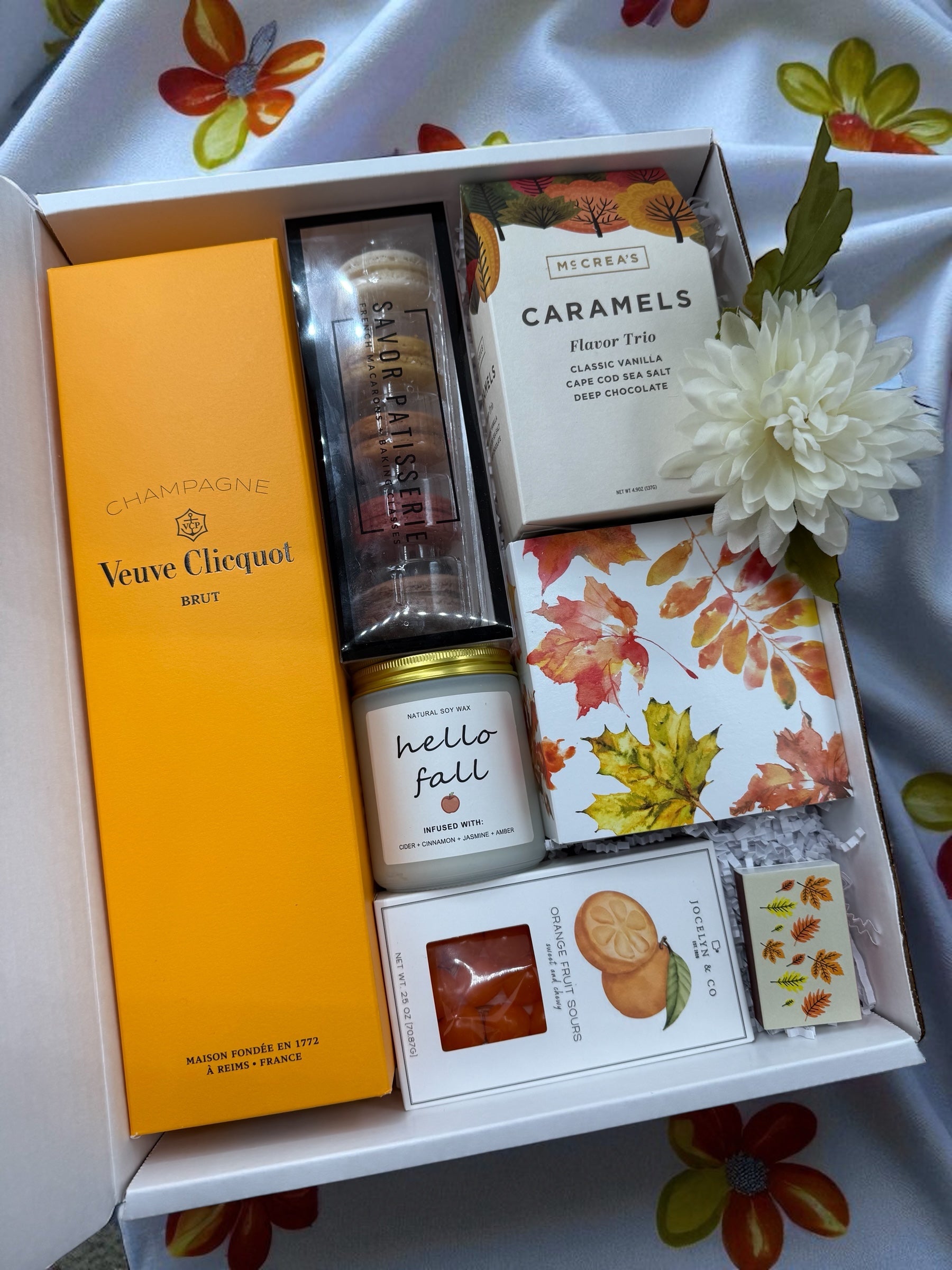 This exquisite fall gift box is a celebration of autumn’s finest pleasures. At its heart lies a bottle of Veuve Clicquot champagne, a perfect, celebratory complement to the season. The box is filled with decadent fall cookies, handcrafted caramels with rich, buttery flavor, and vibrant orange candies for a touch of seasonal sweetness. Delicate macarons add a modern and elegant twist, while a cozy, fall-scented candle and bespoke matches provide a warm, inviting ambiance. It’s a perfect offering for a special occasion or a thoughtful gift for someone who deserves a moment of pure luxury.